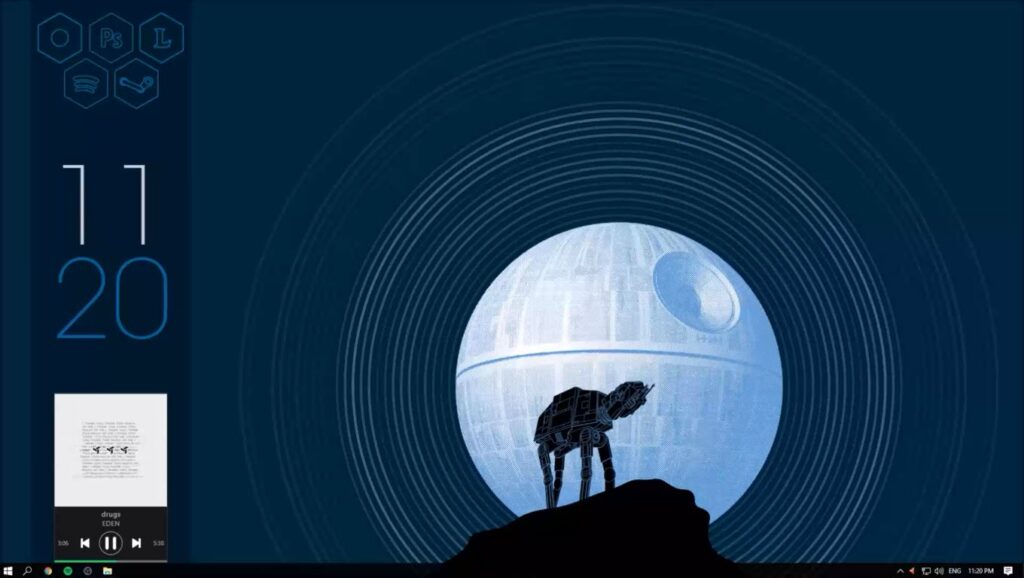 Howling AT-AT skin’s main theme color is dark blue. To the left comes the widget panel with widgets like the music player and time. Coupled with stunning wallpaper, the skin looks nice.