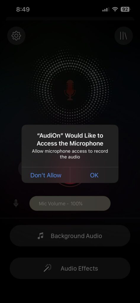 You need to provide AudiOn permission to access the microphone. Just tap OK.