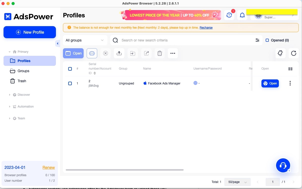 Once created, click the Open button next to the profile name under the Profile section to open the browser window based on the selected browser engine.