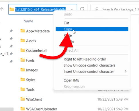 Now copy the path of the WSA Package folder. Just click on the address bar from the Windows File Explorer and copy the complete path. Keep it in the clipboard. We will need it in the next steps.