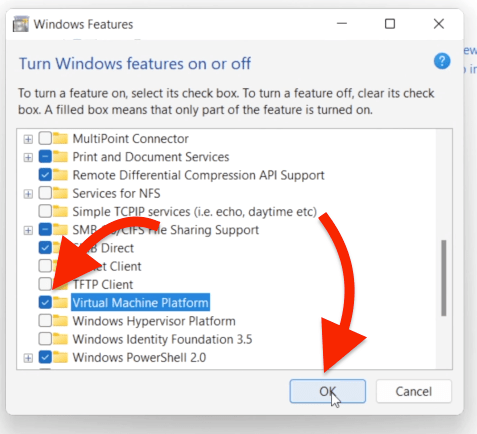 Now Windows Features pop up box will appear. Scroll down a bit and find top options called ‘Hyper-V‘ and ‘Virtual Machine Platform‘. Enable these two options and click on OK.